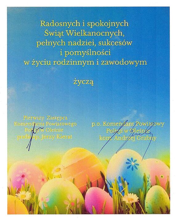 Życzenia Komendanta Powiatowego Policji w Oleśnie z okazji Świąt Wielkanocnych