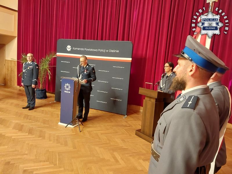 Komendant Powiatowy Policji w Oleśnie, insp. Paweł Kolczyk, podczas swojego przemówienia podziękował władzom samorządowym, służbom oraz instytucjom za bardzo dobrą współpracę, która przyczynia się do skutecznego działania na rzecz bezpieczeństwa regionu. Jednocześnie złożył gratulacje awansowanym policjantom, życząc im dalszych sukcesów zarówno w pracy zawodowej, jak i w życiu prywatnym.
