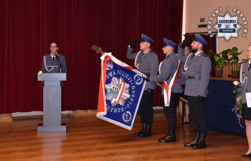 Po nabożeństwie uroczystość przeniosła się do Miejskiego Domu Kultury w Oleśnie, gdzie odbyła się uroczysta zbiórka, poprzedzona krótkim opisem historycznym w odniesieniu do 100-lecia kobiet w Policji. W trakcie spotkania Pierwszy Zastępca Komendanta Wojewódzkiego Policji w Opolu insp. Krzysztof Buchała, wraz z Komendantem Powiatowym Policji w Oleśnie insp. Pawłem Kolczykiem wręczyli akty mianowania na wyższe stopnie policyjne wyróżnionym funkcjonariuszom. Po wręczeniu nominacji na wyższe stopnie policyjne Komendant Kolczyk uhonorował jubileusz 100-lecia kobiet w Policji, wręczając policjantkom kwiaty. W wydarzeniu uczestniczyli także przedstawiciele lokalnych władz samorządowych i instytucji.