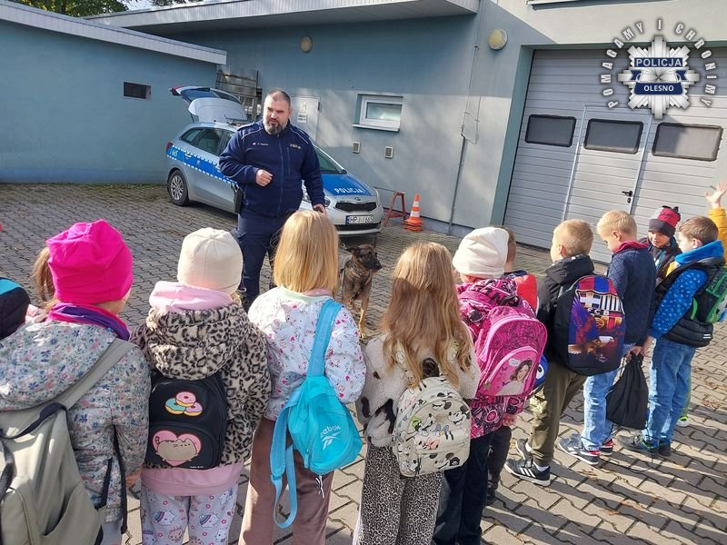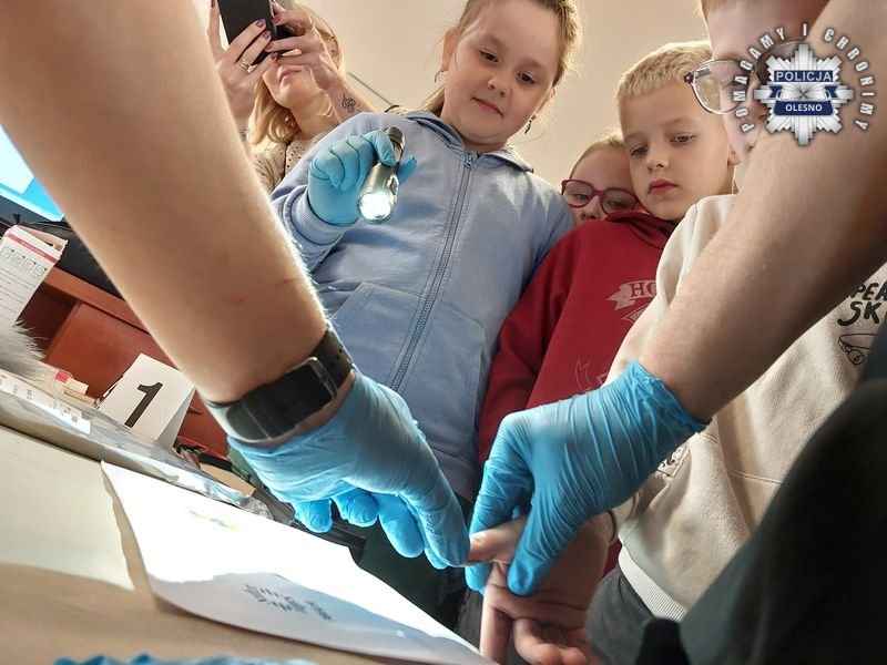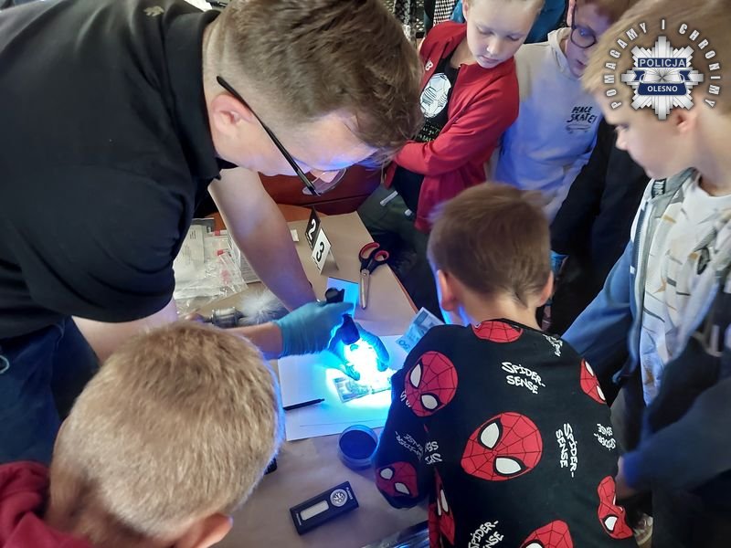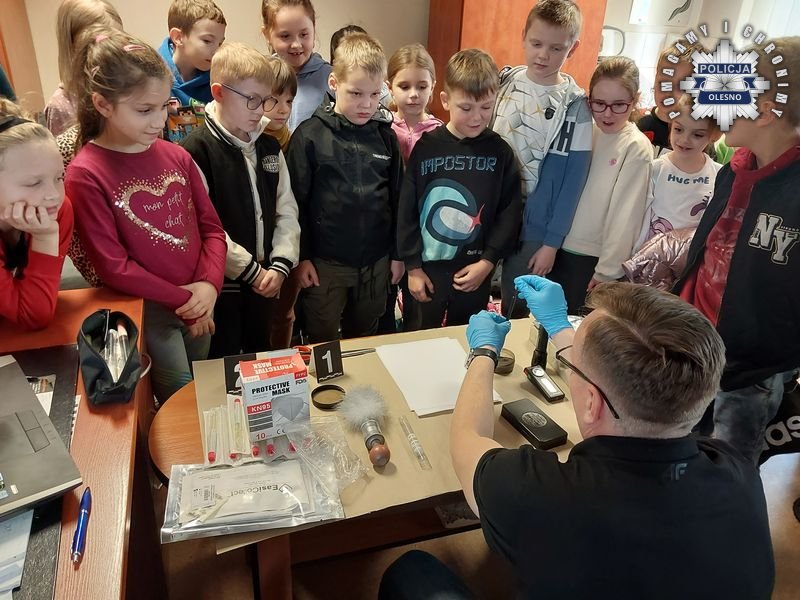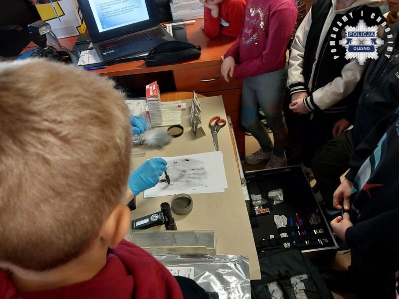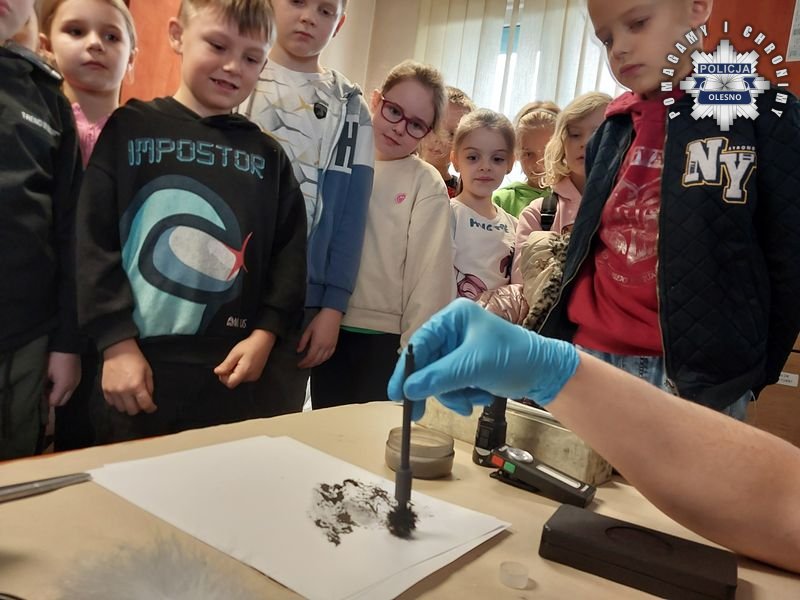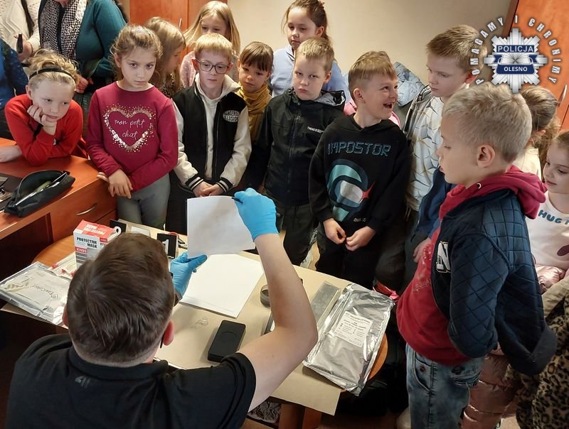 Podczas wizyty dzieci miały okazję zwiedzić pomieszczenia oleskiej komendy, które na co dzień dostępne są jedynie dla funkcjonariuszy. Jednym z najciekawszych punktów programu był pokaz ujawniania i utrwalania śladów, przeprowadzony przez policyjnego technika kryminalistyki. Funkcjonariusz zaprezentował, jak na pozornie białej kartce można uwidocznić odcisk dłoni, w jaki sposób niektóre elementy reagują na promienie UV oraz przedstawił narzędzia używane na co dzień w jego służbie.