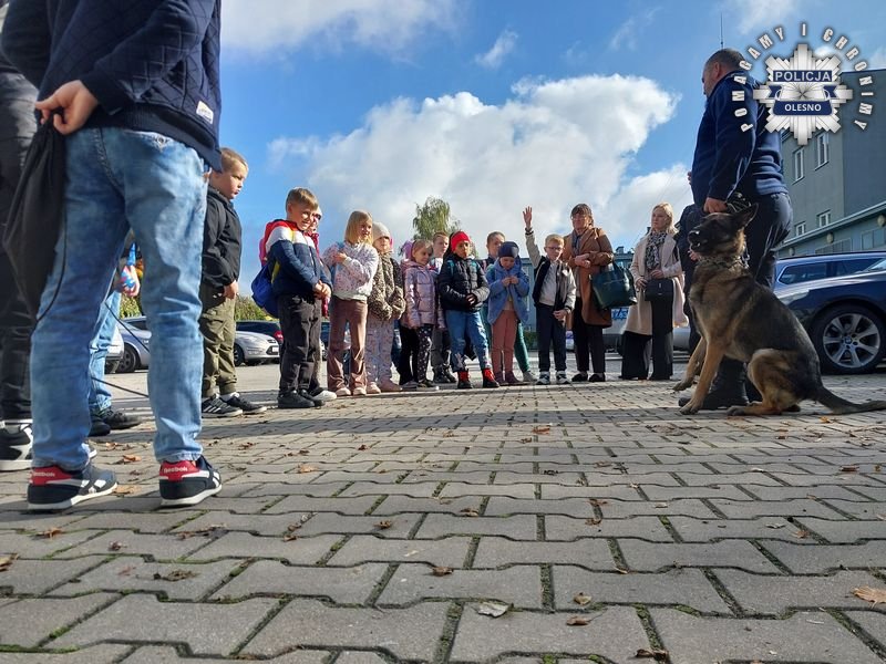 Kolejnym ważnym elementem spotkania była wizyta na placu zewnętrznym komendy, gdzie dzieci mogły poznać pracę przewodnika psa służbowego. Policjant przybliżył młodym gościom specyfikę współpracy z czworonożnym towarzyszem, opowiedział o procesie szkolenia psa służbowego oraz o jego zadaniach podczas codziennej służby, podkreślając znaczenie współpracy człowieka i psa w utrzymaniu bezpieczeństwa.