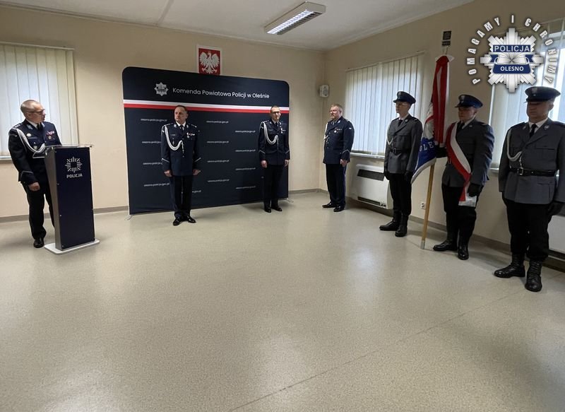W Komendzie Powiatowej Policji w Oleśnie odbyła się uroczysta zbiórka, w związku z powierzeniem obowiązków na stanowisku Komendanta Powiatowego Policji w Oleśnie insp. Rafałowi Drozdowskiemu. Pan Komendant odebrał rozkaz z rąk I Zastępcy Komendanta Wojewódzkiego Policji w Opolu insp. Krzysztofa Buchały. W zbiórce uczestniczyła kadra kierownicza oleskiej komendy, policjantki, policjanci oraz pracownicy cywilni.