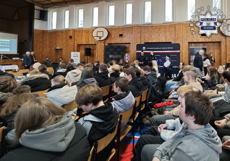 • Zdjęcie w kolorze przedstawia salę gimnastyczną wypełnioną uczniami siedzącymi na krzesłach, w tle   stoisko policyjne z funkcjonariuszami.