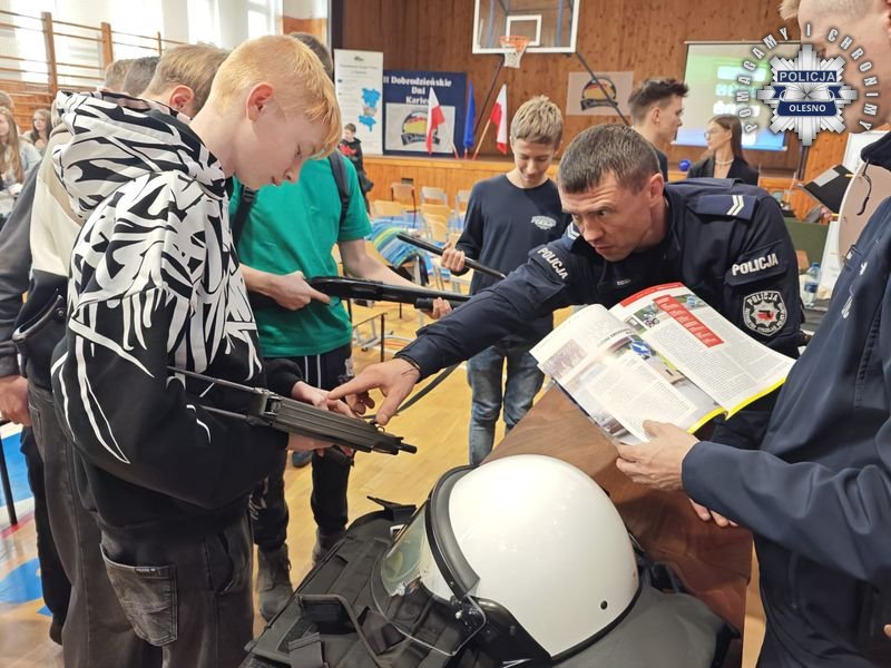 Policjanci z Olesna i Dobrodzienia promowali służbę podczas "Dobrodzieńskich Dni Kariery", które odbyły się w Zespole Szkół w Dobrodzieniu — placówce kształcącej młodzież również w klasach o profilu mundurowym. Funkcjonariusze pojawili się na wydarzeniu nie tylko jako przedstawiciele służby, ale także jako praktyczni doradcy dla uczniów rozważających przyszłość związaną z mundurem. Ich obecność miała na celu pokazanie realiów pracy policjanta i zachęcenie młodych osób do spojrzenia na policję jako jedną z atrakcyjnych ścieżek zawodowych.