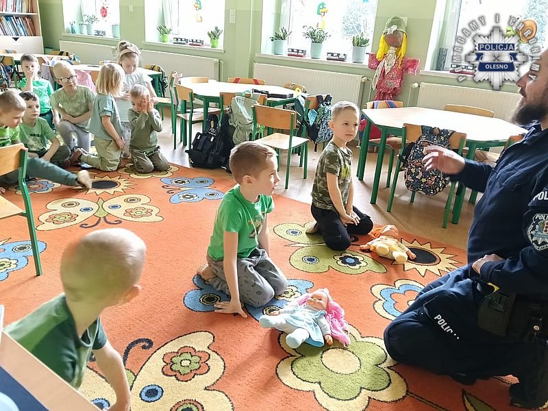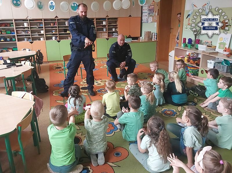 Publiczne Przedszkole w Kościeliskach odwiedzili policjanci z Olesna. Mundurowi spotkali się z najmłodszymi mieszkańcami, aby w radosnej atmosferze porozmawiać o rzeczach niezwykle ważnych. Głównym tematem spotkania było bezpieczeństwo w ruchu drogowym. Dzieci uczyły się, jak należy prawidłowo przechodzić przez jezdnię, dlaczego warto nosić odblaski i jak zachować czujność podczas spacerów. Dodatkowo dzieci miały możliwość poznania elementów wyposażenia indywidualnego funkcjonariuszy.